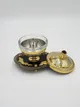 Корпус икорницы изготовлен из бронзы и латуни, подчеркнутых филигранным узором. В качестве декора использован драгоценный агат и хрусталь, которые придают изделию неповторимый блеск и элегантность. Никелированные элементы, выполненные из золота 999,9 пробы, добавляют изделию аутентичности и подчеркивают его премиальное качество.